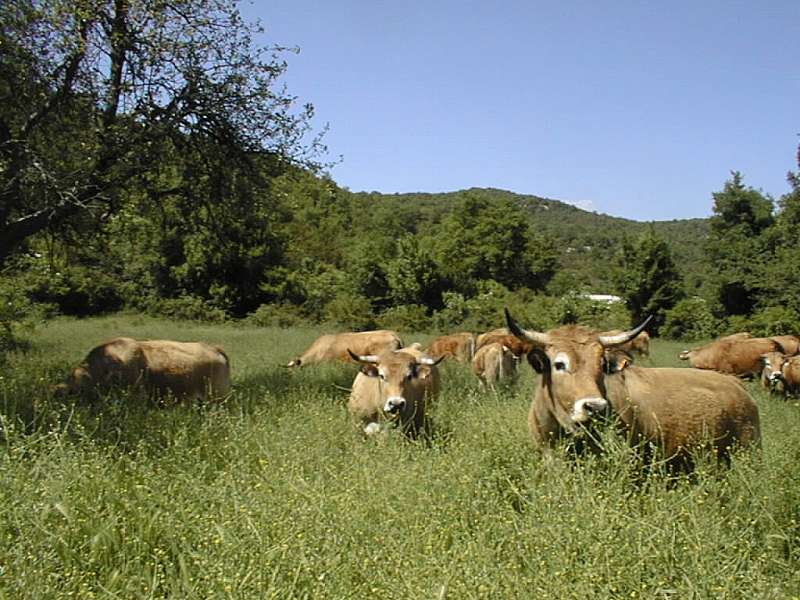 Nous élevons un troupeau de 120 vaches Aubrac, en plein air sur 2500 hectares, autour de la montagne Séranne en piémont Cévenol /Larzac. Nous élaborons un "cru carné" bien typé, dans notre propre laboratoire de découpe situé à Saint Jean de Buèges.